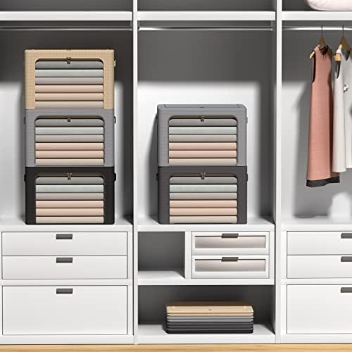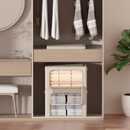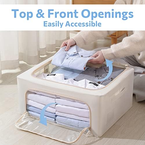 3Pack Frame Storage Box - Clothes Storage Bin Bags Oxford Fabric Foldable Stackable Container Organizer Set with Clear Window & Carry Handles (Beige, Medium-44L)
