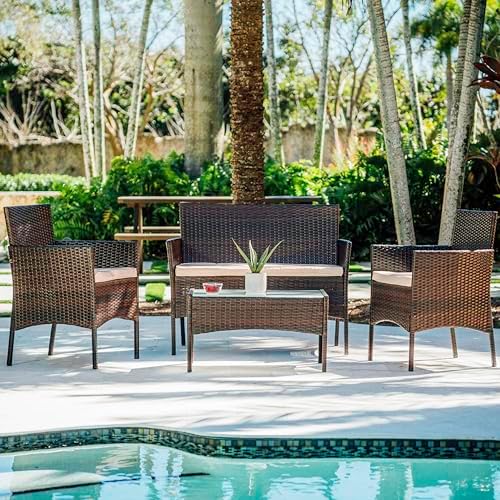 Nestl Wicker Patio Furniture - 4 Piece Set with 2 Chairs, Loveseat, Glass Top Coffee Table, Outdoor Furniture for Backyard, Pool or Porch (Brown\/Beige)