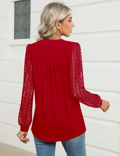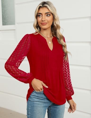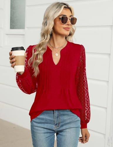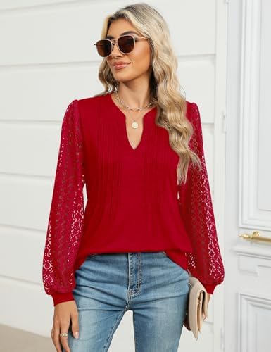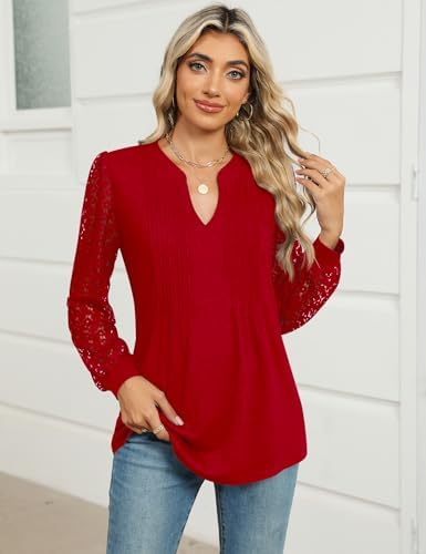Micoson Womens Lace Long Sleeve Tops V Neck Pleated Blouses Dressy Casual Work Shirts