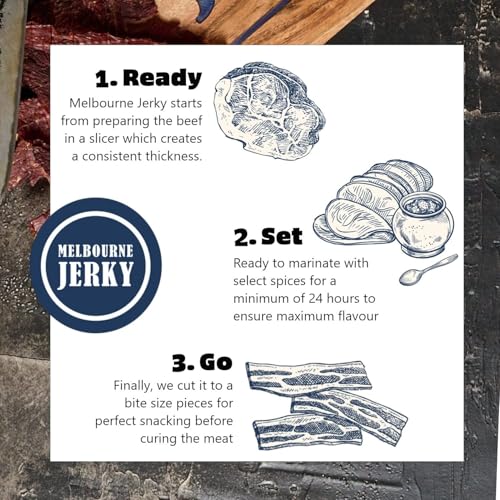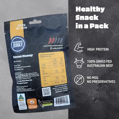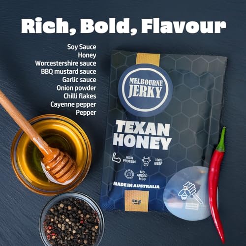 Melbourne Jerky, Premium Beef Jerky, Healthy Snack Alternative, High-Protein Snack, Wholesome, Tender, Juicy, Flavorful, MSA Grade, Australian Made, Ready-to-Eat, 50gms, Texan Honey Flavored
