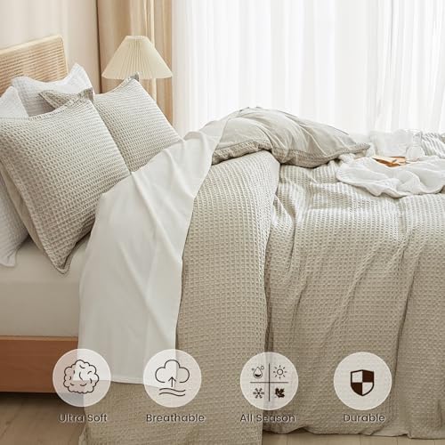 PHF Waffle Weave Duvet Cover Set Queen Size, No Snagging Ultra Soft Luxury Textured Breathable Comforter Cover for All Season 3pcs, Durable Bedding Duvet Set with 2 Pillow Shams, 90"x90", Line