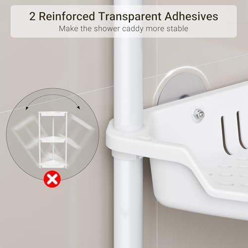 ELYKEN Corner Shower Caddy, 3 Tier Rustproof Floor Standing Shower Organizer, Plastic Metal Splicing Floor Shower Corner Shelf Rack Storage Stands Adjustable Feet & 2 Hooks for Bathroom, White