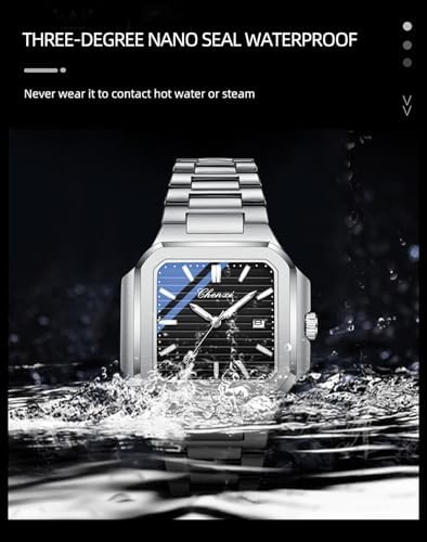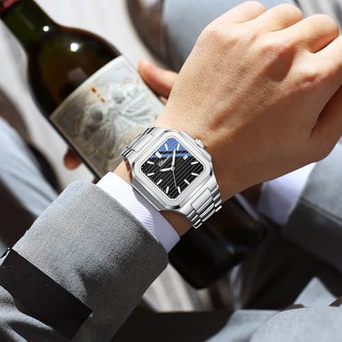 BESTKANG Men's Classic Square Watch - Silver Stainless Steel Analog Quartz Dress Watch with Luminous Hands, Date Calendar, 30M Water Resistant for Business Casual