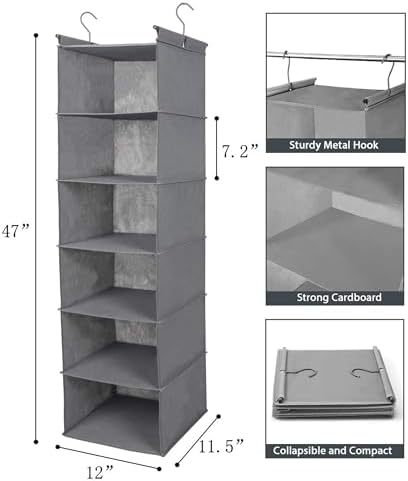 MAX Houser 6 Tier Shelf Hanging Closet Organizer, Closet Hanging Shelf with 2 Sturdy Hooks for Storage, Foldable (Grey)