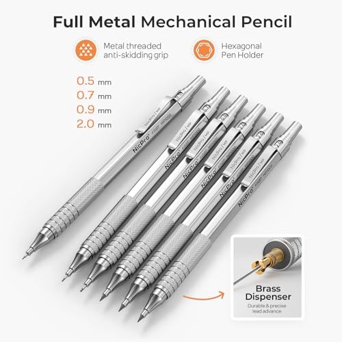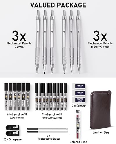 Nicpro 30PCS Silver Metal Mechanical Pencils Set in Leather Case, Art Drafting Pencil 0.5, 0.7, 0.9 mm, 2mm Lead Pencil Holder for Sketching Drawing With 16 Tube (6B 4B 2B HB 2H 4H Colors)Lead Refill