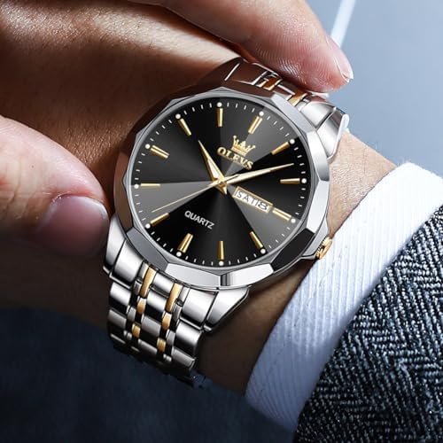 OLEVS Men Watches Business Dress Diamond Analog Quartz Date Luxury Wrist Watch Casual Stainless Steel Waterproof Luminous Two Tone Watch for Men