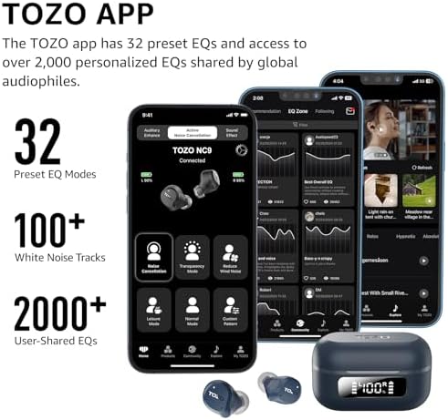 TOZO Hybrid Active Noise Cancelling Wireless Earbuds, 6 Mics ENC Clear Call, IPX8 Waterproof, in Ear Bluetooth 5.3 Headphones Stereo Bass Ear Buds 59H Playtime with LED Display 32 EQs via APP