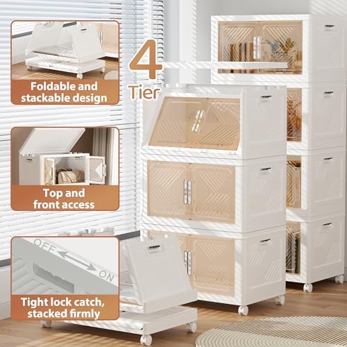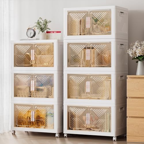 pioncrey Storage Bins with Lid 76QT, Stackable Storage Containers with Wheels and Magnetic Doors, Plastic Clothes Closet Organizers and Storage Box for Pantry, Home and Office (4 Pack)