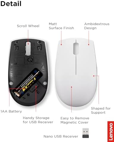 Lenovo 300 Wireless Mouse \u2013 Computer Mouse for PC, Laptop with Windows \u2013 Ambidextrous Design \u2013 2.4 GHz Nano USB Receiver \u2013 12 Month Battery Life
