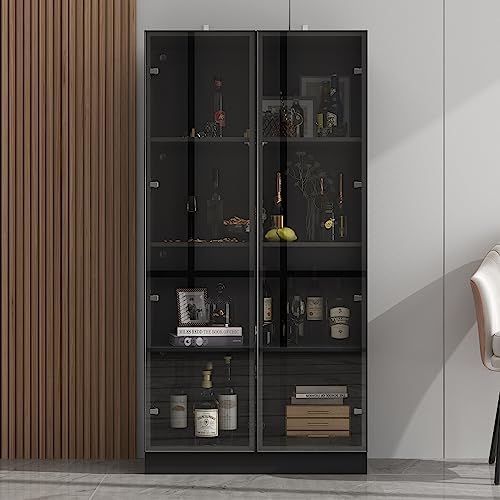 Homsee Bookcase Bookshelf with 4-Tier Shelves, 2 Glass Doors and LED Lights, Wooden Display Storage Cabinet for Home Office, Living Room, Black (31.5\u201DW x 15.7\u201DD x 63\u201DH)