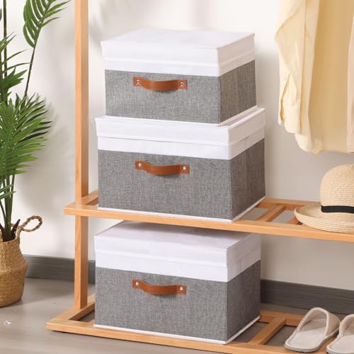 YheenLf Fabric Storage Boxes with Lids, Linen Foldable Cloth Baskets, Closet Organizer Containers with Double Handles, Sweater Bins for Bedroom, White and Grey, 3 Pack, 13 x 9.1 x 7.9 Inch