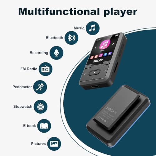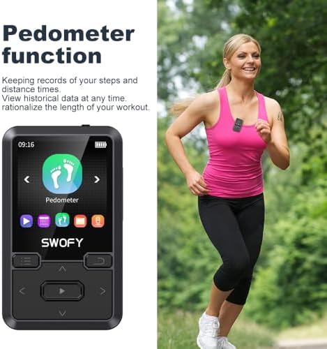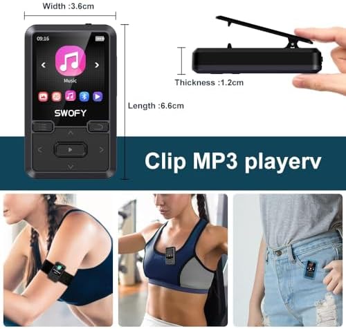 32GB Clip MP3 Player with Bluetooth 5.0, SWOFY M10 Music Player Support Max 128GB TF Card, Mini Design Ideal for Sports,FM Radio, Pedometer, A-B Repeat, Audio Shuffle Playback - Black