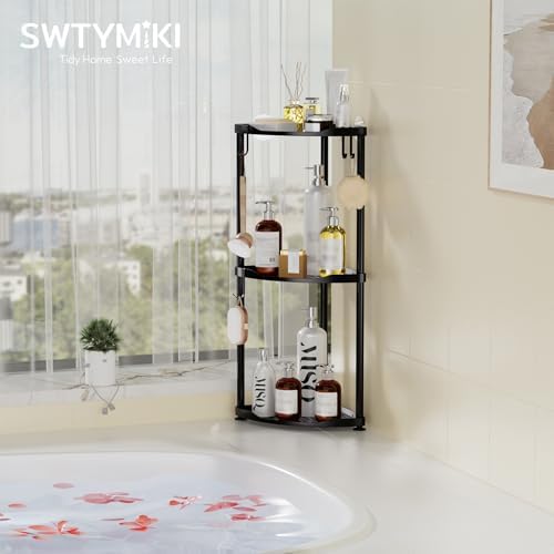 SWTYMIKI Corner Shower Caddy Standing - 3 Tier Stainless Steel Shower Organizer Stand, Large Capacity Floor Shelf with 4 Hooks, Rustproof Bathroom Storage Rack, Black