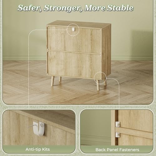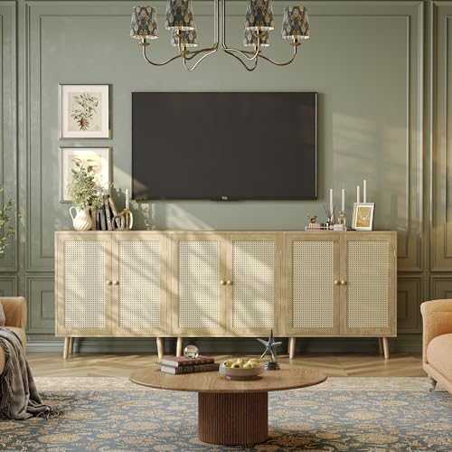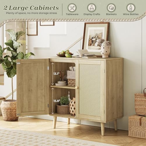 Huuger Buffet Cabinet with Storage, Storage Cabinet with PE Rattan Decor Doors, Accent Sideboard Buffet with Solid Wood Feet, for Hallway, Entry, Living Room, Natural