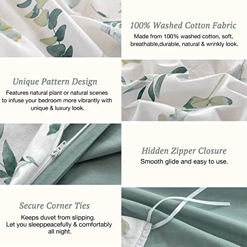 MILDLY Down Duvet Cover Medium Double Bed -100% Water Washed Cotton Grey Green Eucalyptus Double sided Flower Down Duvet Cover 3-Piece Set with Zipper Sealing Corner Lace