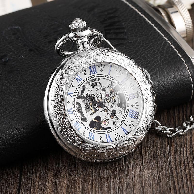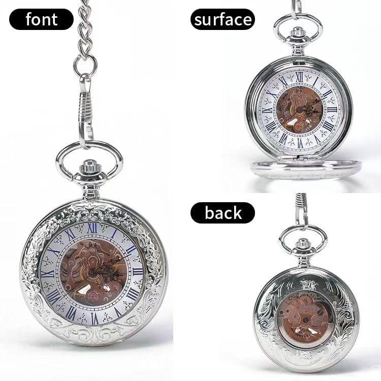 BOSHIYA Retro Mechanical Pocket Watch Men's Night Light Steampunk Pocket Watch with Chain Black Skeleton Dial Roman Digital Pocket Watch Father's Day Gift